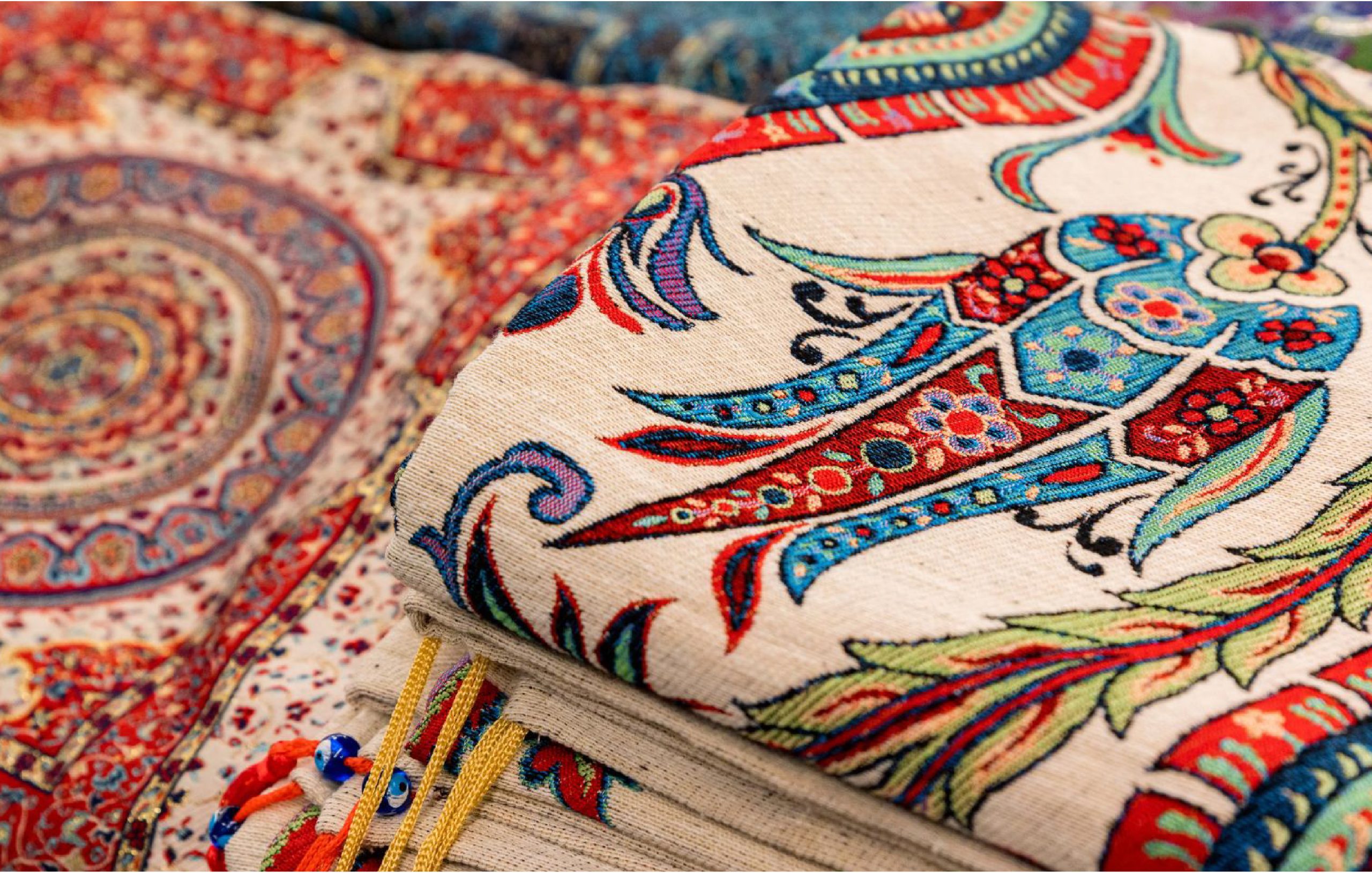 Les textiles jouent un rôle important en décoration orientale. Les tapis, les coussins, les rideaux et les nappes sont souvent ornés de motifs géométriques ou floraux, de broderies et de franges. Les tissus les plus couramment utilisés sont le lin, le coton et la soie.